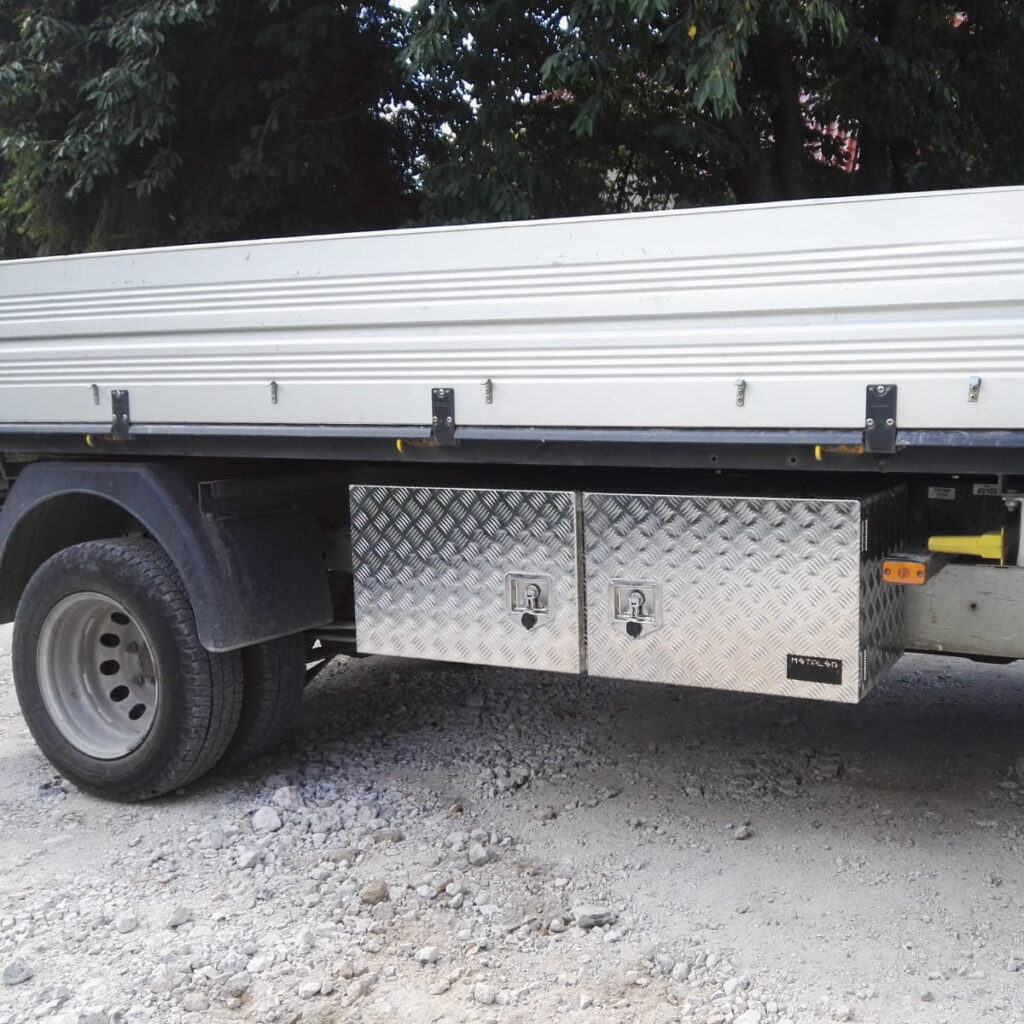 Przestrzeń w nadkolach samochodu dostawczego / ciężarowego idealnie nadaje się do zabudowy otwieranymi skrzyniami metalowymi. Dzięki taki skrzyniom można mieć łatwo dostępne i dobrze zabezpieczone niezbędne rzeczy czy narzędzia do pracy/ obsługi samochodu. Skrzynie są zabezpieczane indywidualnym zamkiem.